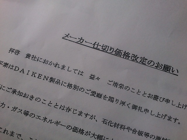 円安や原油価格の上昇により材料価格の改定の知らせが来ました。