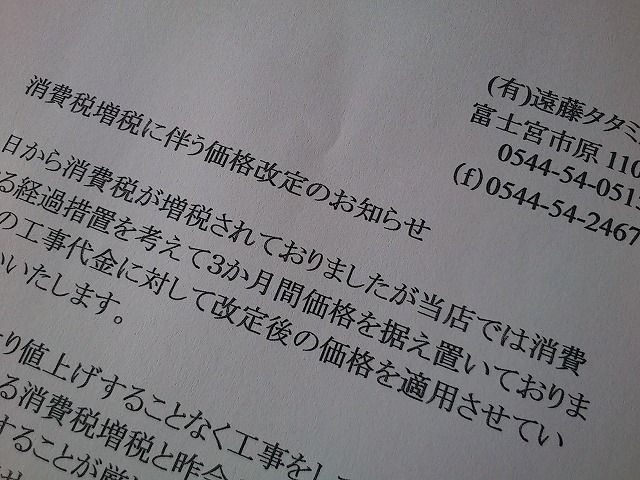 出来るだけ上げないようにやってきましたが畳表の値上がりが大きく(数年前より2割以上のアップ)これに消費税も増税となりやむなくです。