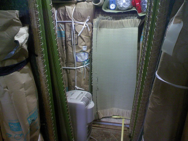 DCF_0310.jpgリフォーム開始前に預って表替えをしておいて納品まで保管していたのですがあまりの湿気と暑さでカビの発生が心配になってきたので倉庫に入れて除湿機を使用しての乾燥です