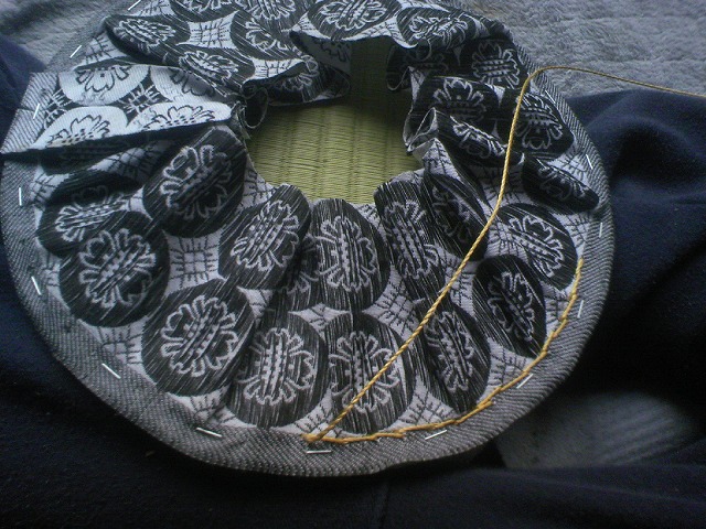 ゴザを二枚張り合わせて切り抜いた後ヘリを縫い付けています。