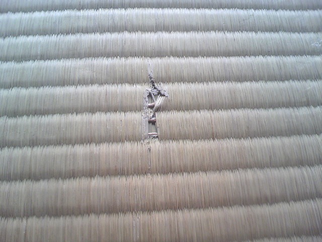DCF_0262.jpg納入から数年経過の畳ですが何かを落としたのか穴や傷が目立つので交換の依頼、ですが広間のため新しくしてしまうと目立ってしまうので「同程度に日焼けしたものと交換して欲しい」と指定されました・・・