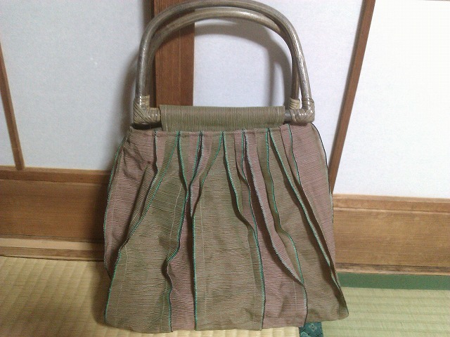 畳縁を使用したバッグです。先日の市民講座のとき「縁を分けて欲しい」という方が何名かいてハンパ物なのでお土産に持っていってもらったのですがその縁を利用して素敵なバッグを製作して持ってきてくれました。