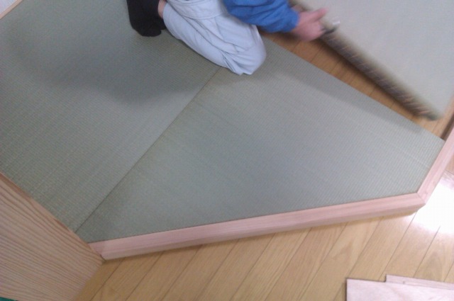 普通の部屋でも手間のかかる縁無畳ですが斜めだったり柱があったりして変形していると更に手間も掛かりますし作るのが困難になります。