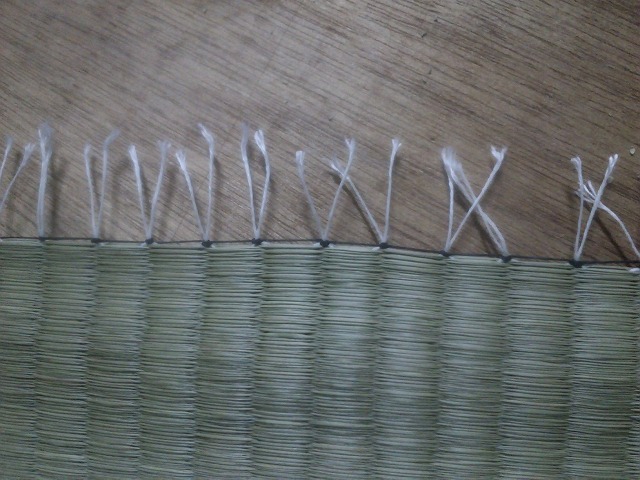 技能試験で薄縁(ござ)の製作があるので練習しているのですが畳表を裁断後そのままではほつれてばらばらになってしまうので縦糸を結びほつれないようにします。
