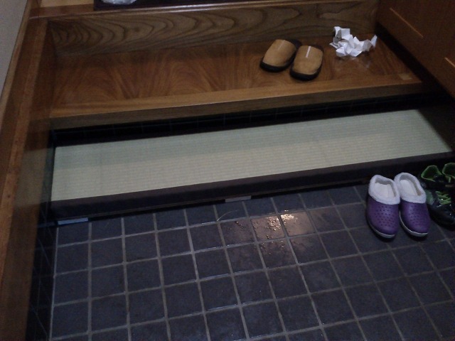 玄関の上り段に、すのこ状の敷板のうえに置いてみました。