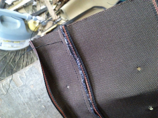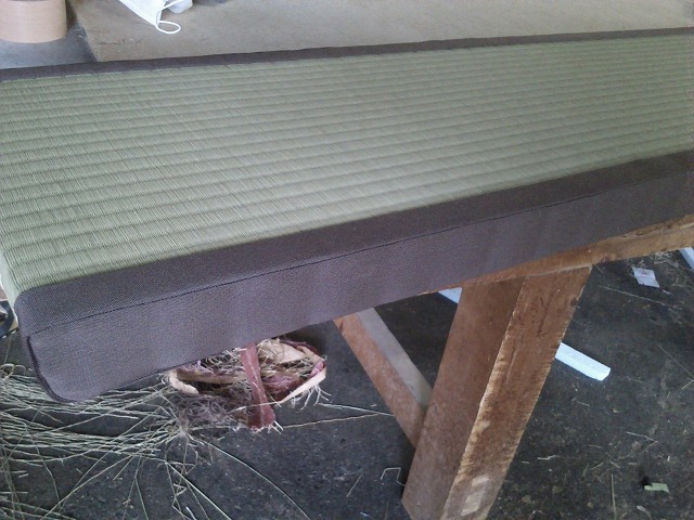 無地縁をミシンで縫い合わせて縫い合わせ部分を角になるようにして延長して側面に縫跡が見えないようにして置き畳を製作しました。