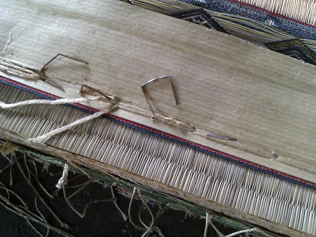 へりの逢着不良部分に金属ピンが・・・ヘリを取り外すため包丁をヘリと畳表の間に入れて糸を切っていると・・・「ガリッ」と音が、外してみると縫い損ねた部分を金属ピンで止めてありました。